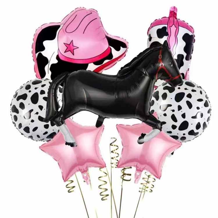 Z natančnimi linijskimi obrisi in barvnim ujemanjem obnovijo mišične konture in tekoče grive tekačih konj, običajne naravne barvne sheme, kot sta rjava in črna, pa se bolje ujemajo z resnično podobo konj. Nekateri baloni iz folije na temo kavboja celo dodajo kovinske barve, kot sta srebrna in zlata, da povečajo vizualni učinek; kravji vzorec je okrogel, na njem so natisnjeni črno-beli kravji vzorci, nekateri slogi pa dodajo nekaj tridimenzionalnih okraskov, kot so majhni zvončki insh repki pod baloni iz aluminijaste folije, ki so prikupni in imajo podeželski slog ter so zelo priljubljena tema za kavbojske dejavnosti za družine.