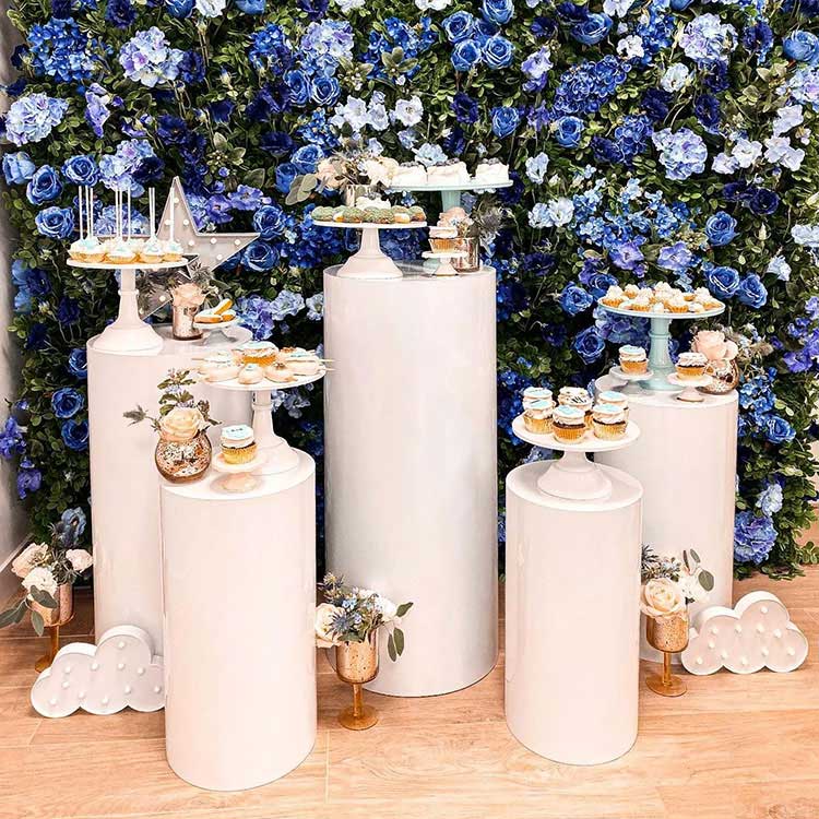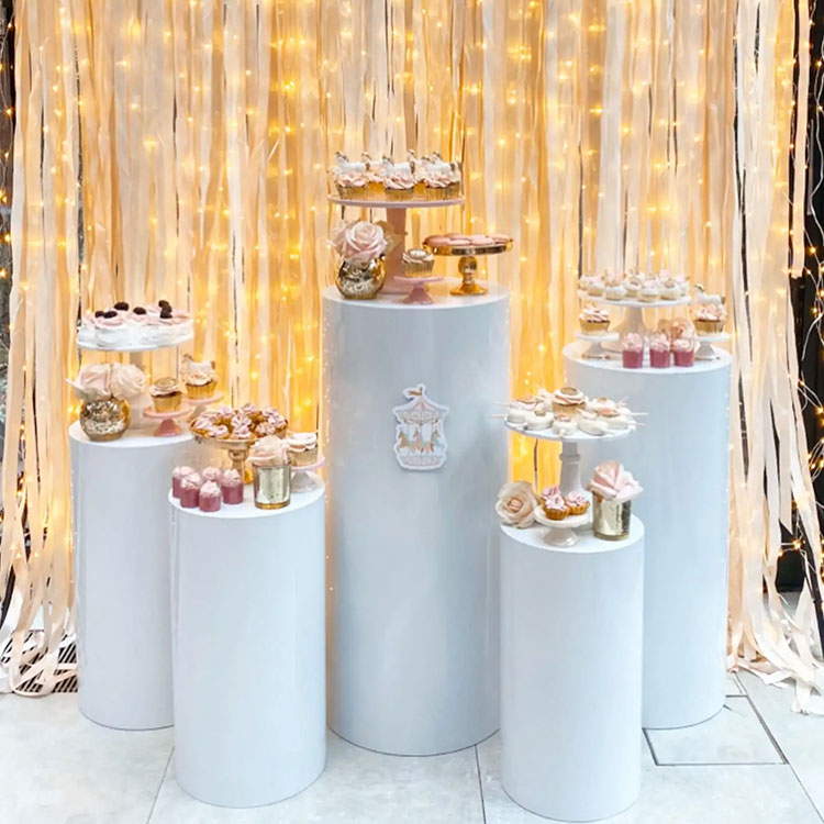 Cilindrične mize za sladice se lahko uporabljajo na zabavah, porokah, rojstnodnevnih dogodkih, podjetja pa jih lahko uporabljajo tudi za razstavljanje umetnin, rož, nakita itd.