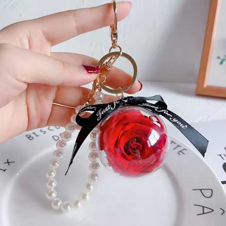 Obesek za ključe Eternal Flower podjetja New Shine se ponaša z okroglo, visoko prosojno dekoracijo iz akrilne krogle, ki bolje ščiti ohranjeno rožo in omogoča lažje shranjevanje. Njegovo glavno telo ima premer natančno 5 cm in tehta približno 32,5 gramov. Velik je kot dlan, ni okoren, ko ga obesite na ključe, in na torbi ni videti neustrezen. Na voljo je več barv.