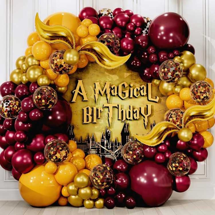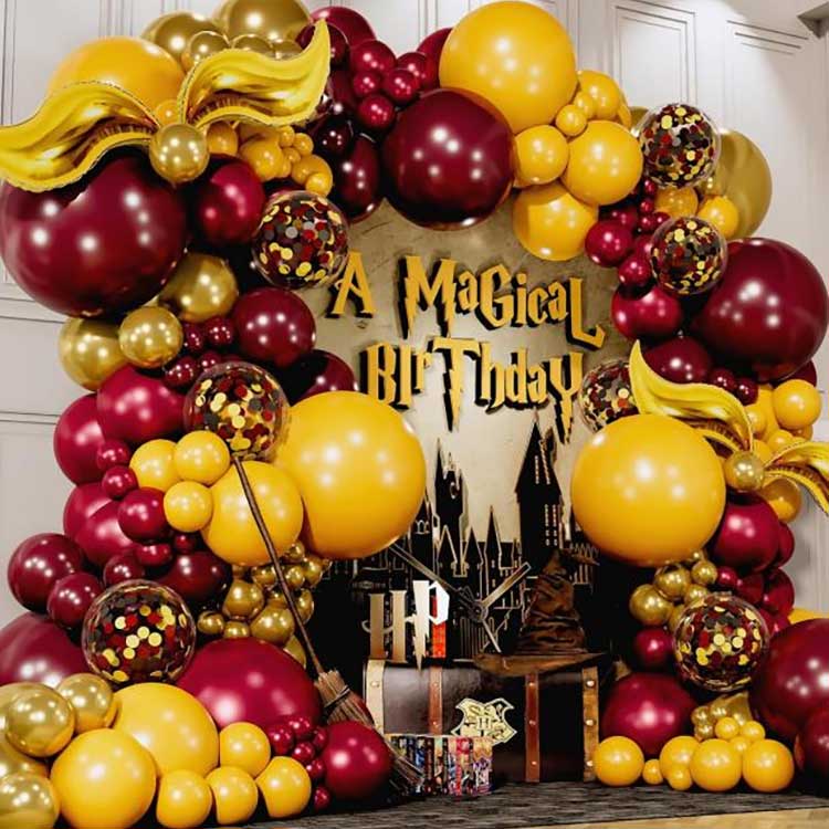 Zasnova kompleta vencev iz balonov Harry Potter je velika in lepa venca iz balonov; v tem kompletu so vsi baloni iz lateksa izdelani iz kakovostnega, čistega naravnega lateksa, določene debeline in elastičnosti ter odlične kakovosti; njegove tipične značilnosti so svetle barve in visoka zvestoba reprodukcije, zaradi česar je tipična značilnost, ki omogoča vsem, ki imate radi čarobne čarovnike, da se počutijo, kot da so tam. Poleg standardnih okroglih balonov so v kompletu tudi okrasni baloni iz folije v obliki zlatega roga. Ko so napihnjene, jih lahko postavite kamorkoli po svojih željah.