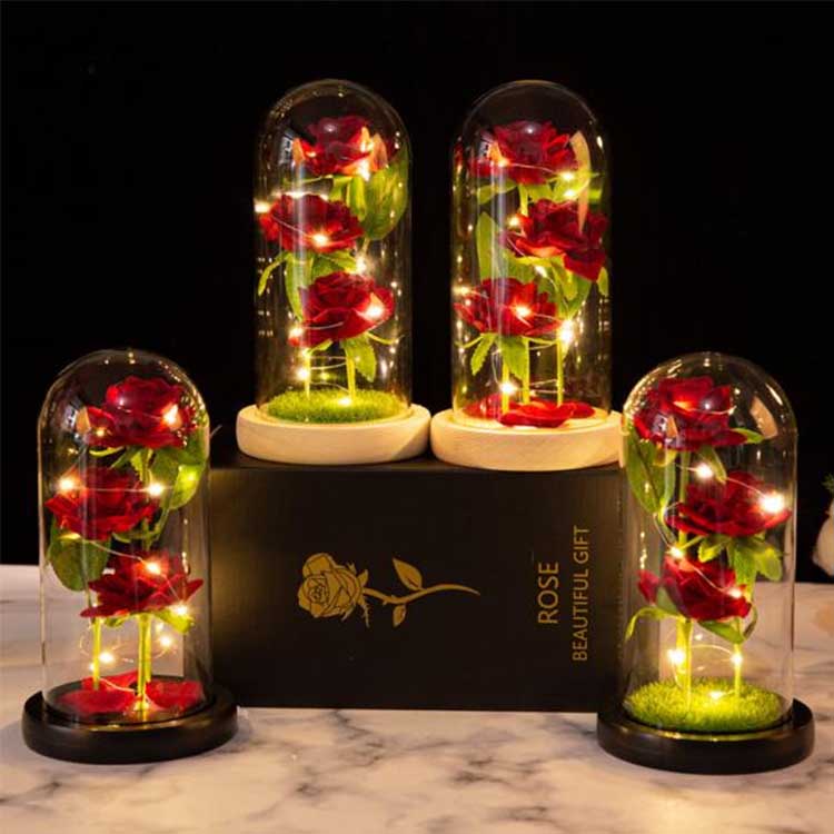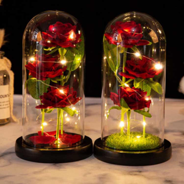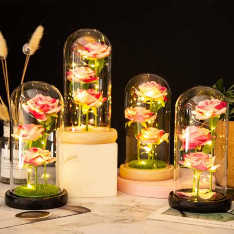 Znotraj rožnate steklene kupole so trije ohranjeni cvetovi, postavljeni na različnih višinah, z realističnimi stebli in zelenimi listi. Stekleni pokrov je odporen na vročino in se ga ne da zlahka poškodovati. LED luči na nizu imajo vgrajeno mehko osvetlitev, stikalo pa se nahaja pod lesenim podstavkom za enostavno upravljanje. Primerno za uporabo pri poročnih dekoracijah in opremi doma, lahko pa ga podarite tudi kot darilo ob obletnici ali rojstnodnevno darilo. Komplet vsebuje minimalistično stekleno kupolo in prilagodljiva darilna kartica.