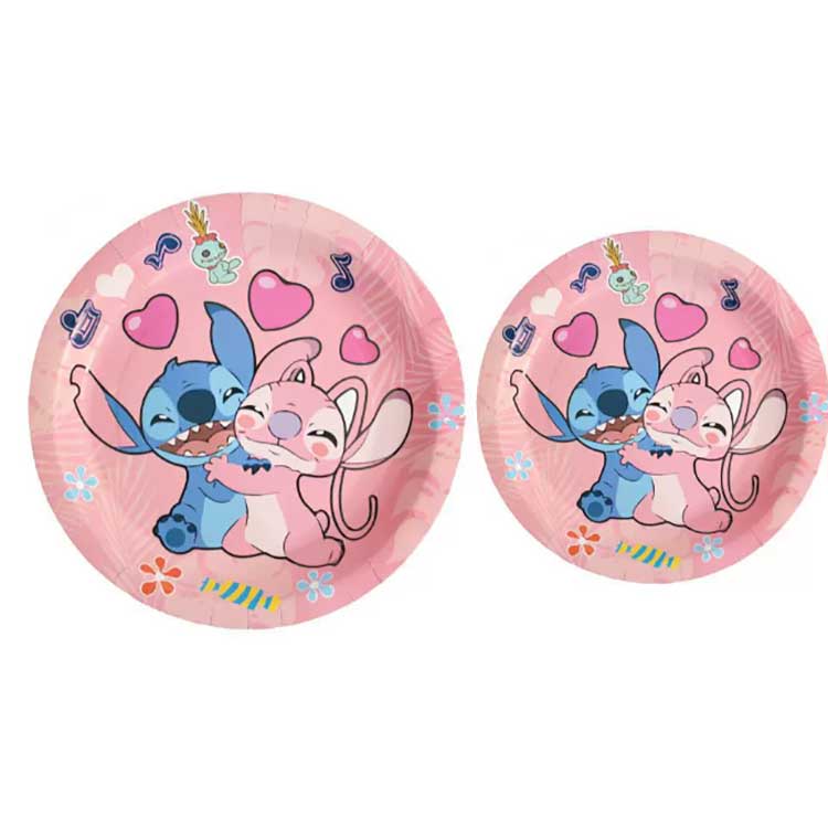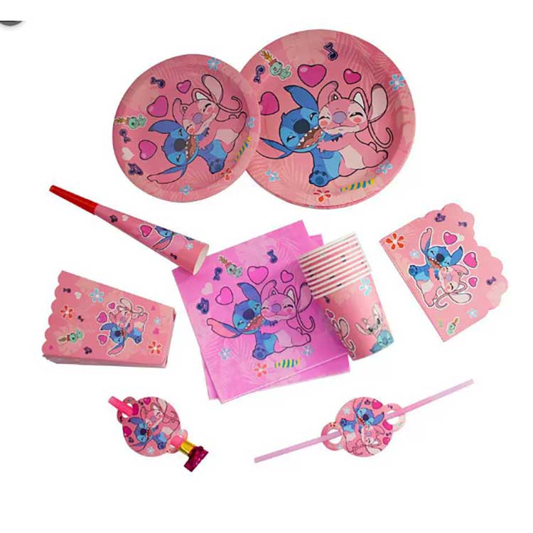 Set krožnikov za enkratno uporabo Stitch vključuje naslednje izdelke: 7-palčni krožniki (10 kosov/vrečko), 9-palčne krožnike (10 kosov/vrečko), prtičke (20 kosov/vrečko), zastavice (10 kosov/vrečko), darilne vrečke za vračilo (10 kosov/vrečko), škatle za pokovko (6 kosov/vrečko), pihajoče zmaje (6 kosov/vrečko), papirnate klobuke (6 kosov/vrečko), papirnate skodelice (10 kosov/vrečko), rogove (6 kosov/vrečko), slamice (10 kosov/vrečko), vabila (10 kosov/vrečko), maske (10 kosov/vrečko), žlice, jedilni pribor (10 kosov/vrečko) in prt (1 kos/vrečko). Set vsebuje 17 različnih vrst izdelkov. Stranke se lahko odločijo za nakup celotnega kompleta ali pa izberejo le del artiklov, ki ustrezajo njihovim potrebam.